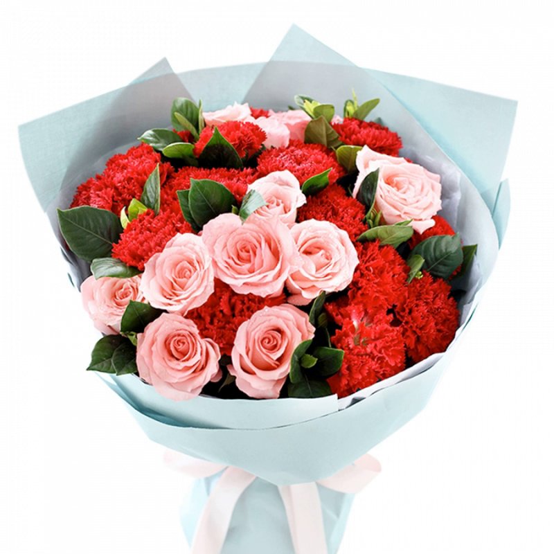 Букет состоит из 11 розовых роз, 14 гвоздик, зелень, красивая упаковка, атласная лента.