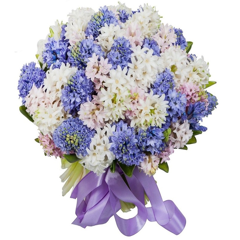 Букет состоит из MIX из 45 гиацинтов, прозрачная упаковка, атласная лента.