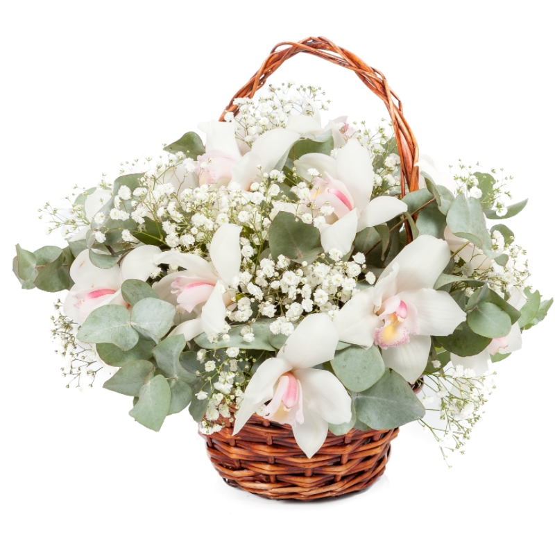 Букет состоит из 11 орхидей, 5 гипсофила, зелень, корзина, оазис.