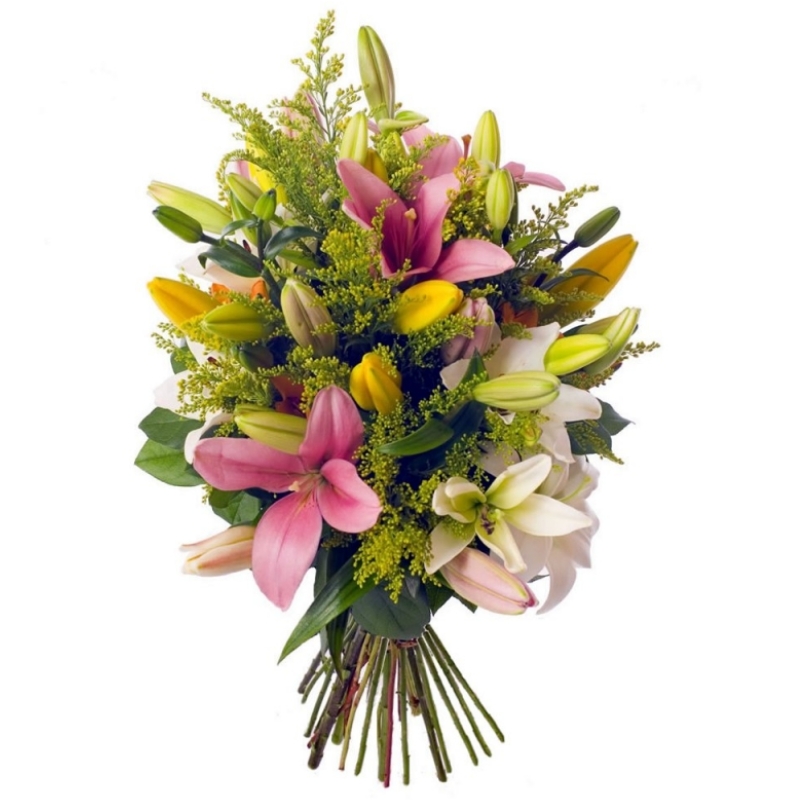 Букет состоит из 5 разноцветных лилий, 7 веток солидаго, прозрачная упаковка, атласная лента.
