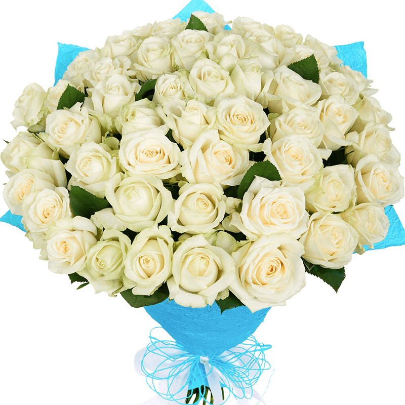 Букет состоит из 51 белая роза, синяя или голубая упаковка.