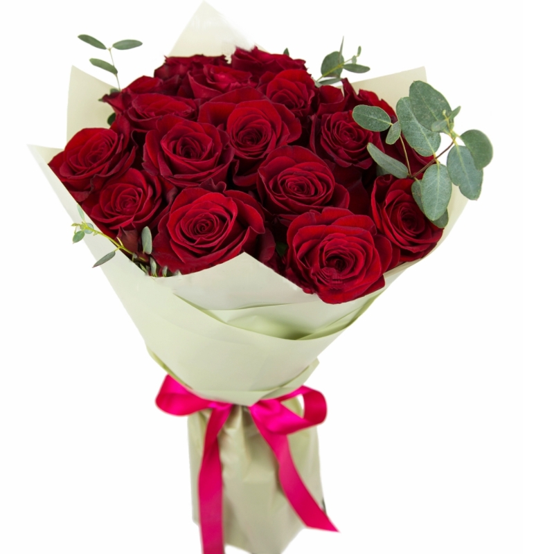 Букет состоит из 19 бордовых роз, эвкалипт, красивая упаковка, атласная лента.