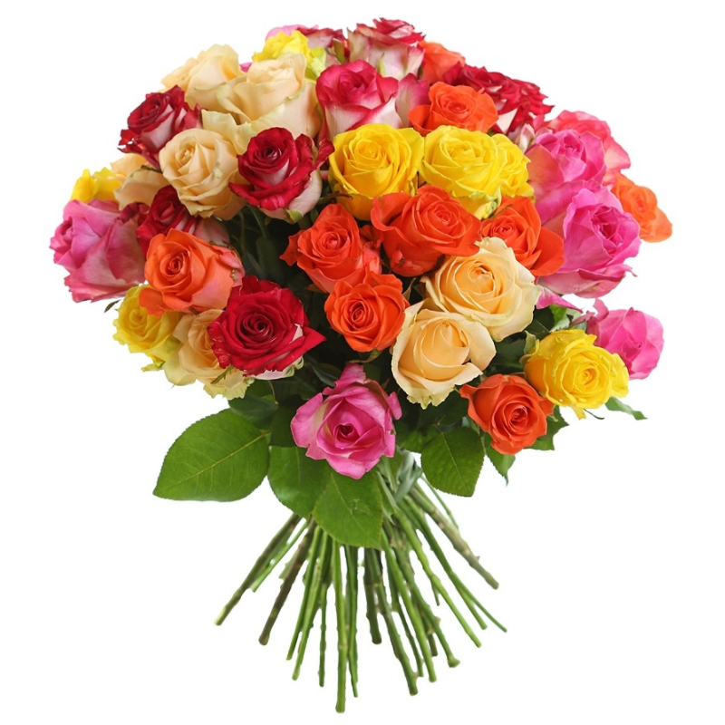 Букет состоит из MIX из 51 розы, прозрачная упаковка, атласная лента.
