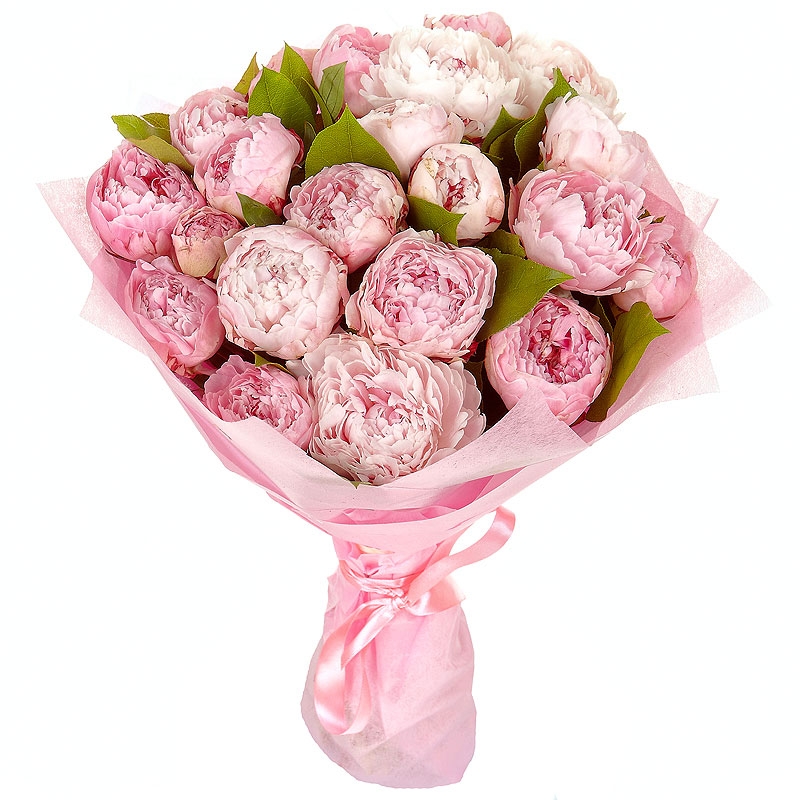 Букет состоит из 21 розовый пион, зелень, красивая упаковка, атласная лента.