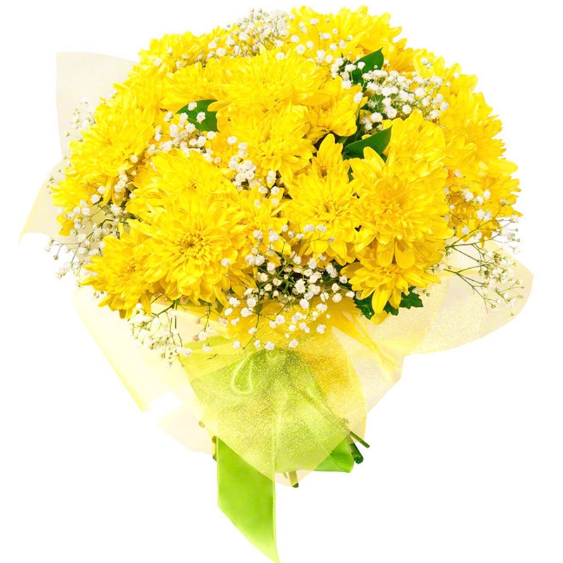 Букет из желтых хризантем и гипсофилы