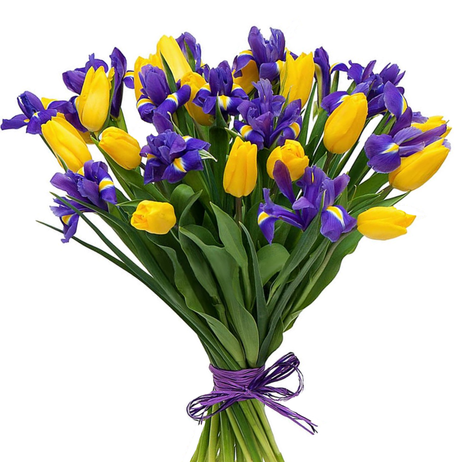 Букет состоит из 15 желтых тюльпанов, 16 ирисов, прозрачная упаковка, атласная лента.