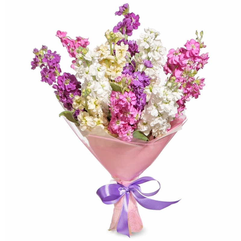 Букет состоит из MIX из 15 маттиол, красивая упаковка, атласная лента.