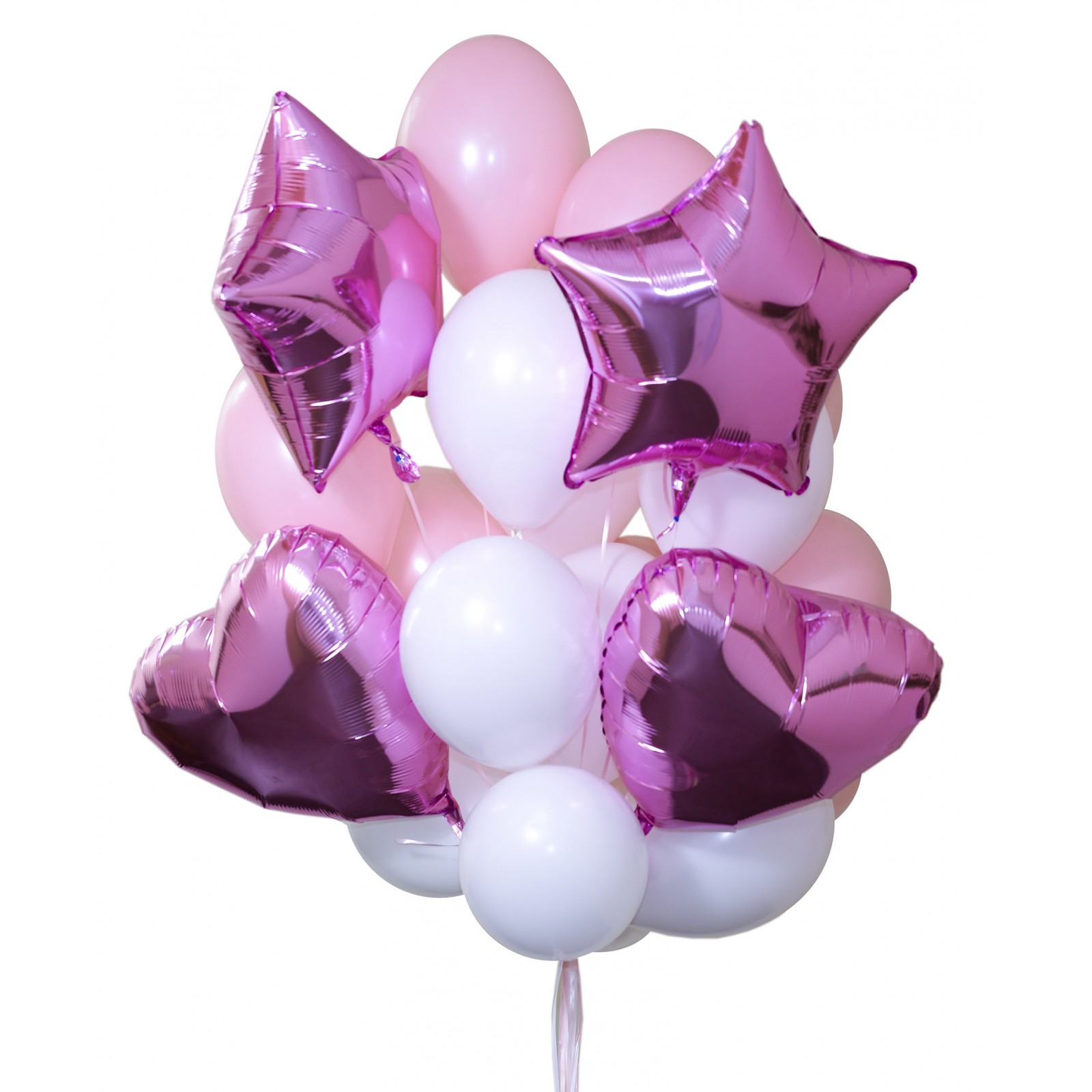 Такой фонтан шаров можно подарить на выписку из роддома или же девочке в День Рождения. В состав фонтана входят 2 звезды, 2 сердца, 8 белых и 8 розовых шаров.