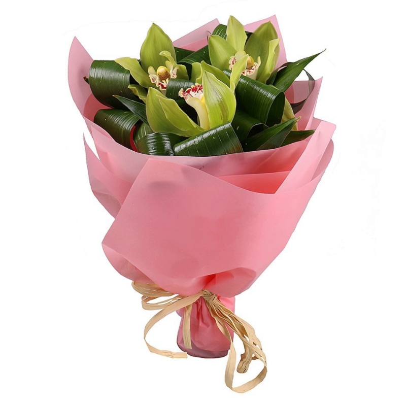 Букет состоит из 3 орхидеи, аспидистра, красивая упаковка, атласная лента.