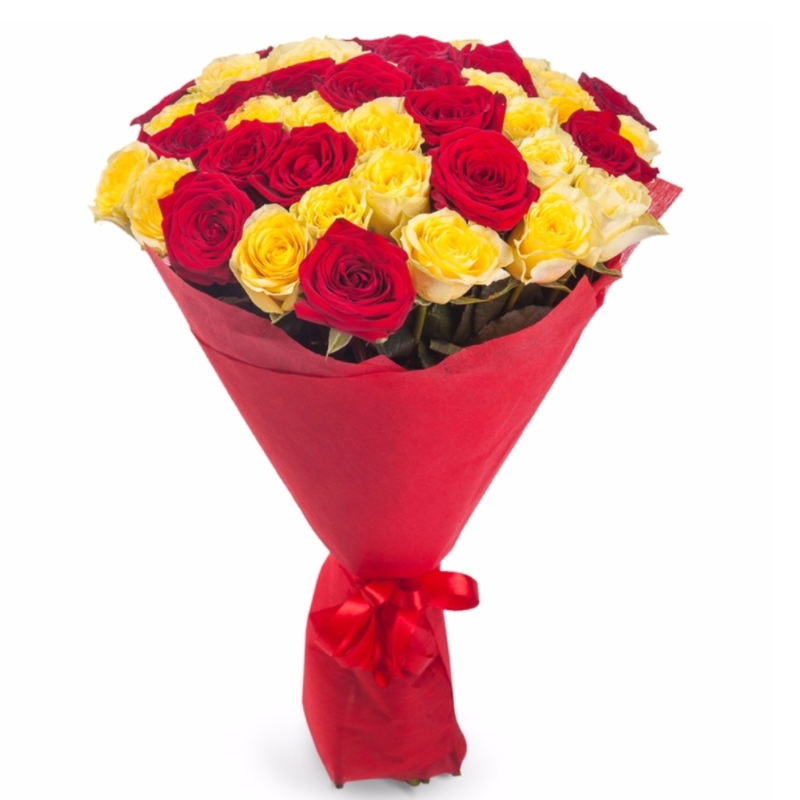 Букет состоит из 11 красных роз, 10 желтых роз, красивая упаковка, атласная лента.
