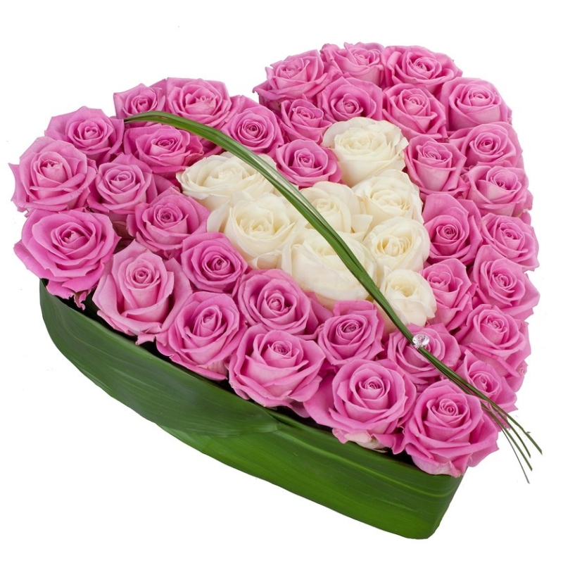 Сердце из 45 розовых и белых роз