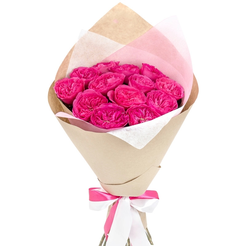 Букет состоит из 13 пионовидных роз, крафт, атласная лента.