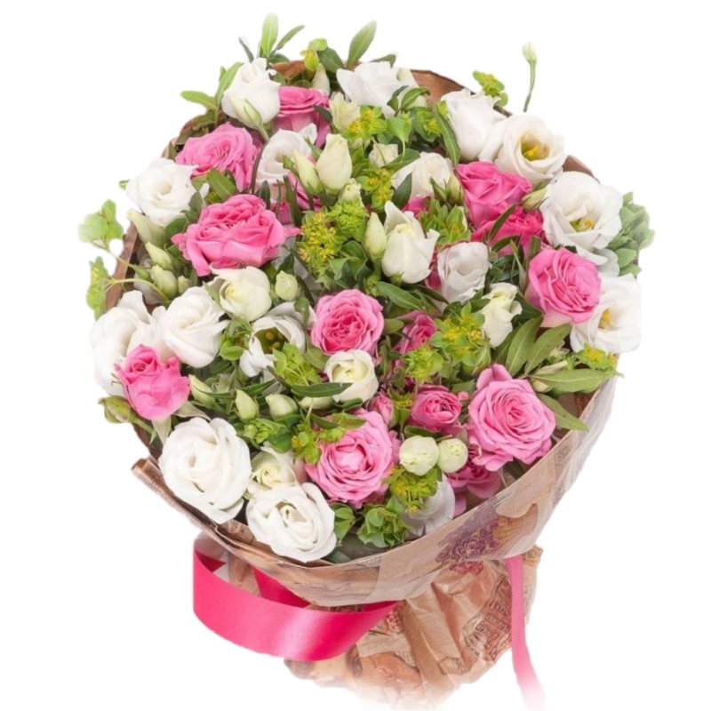 Букет состоит из 7 кустовых роз, 10 веток эустомы, зелень, крафт, атласная лента.